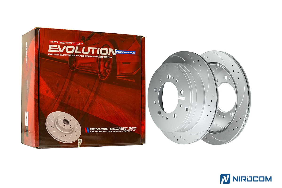 Тормозные диски PowerStop Evolution выполнены из чугуна с повышенным содержанием хрома и никеля. Слоты и перфорация служат как для охлаждения, так и для улучшения коэффициента трения и эффективной работы в различных внешних условиях. Лучшее решение для динамичной и спортивной манеры езды и несравнимая стойкость к перегреву. Все тормозные диски PowerStop Evolution спроектированы в полном соответствии с оригинальными размерами и спецификациями. Прецизионная лазерная чистовая обработка гарантирует их простую и быструю установку, а также безотказную работу на протяжении всего срока службы. Весь тормозной диск, включая внутренние лопасти покрыт запатентованным составом GEOMET® (смесь с использованием дихромата серебра и цинка) которое чрезвычайно стойко к окислению и коррозии, не влияя при этом на эффективность торможения.