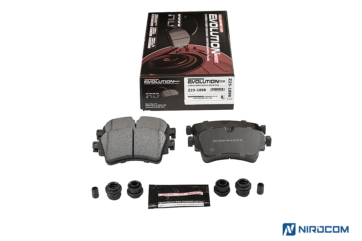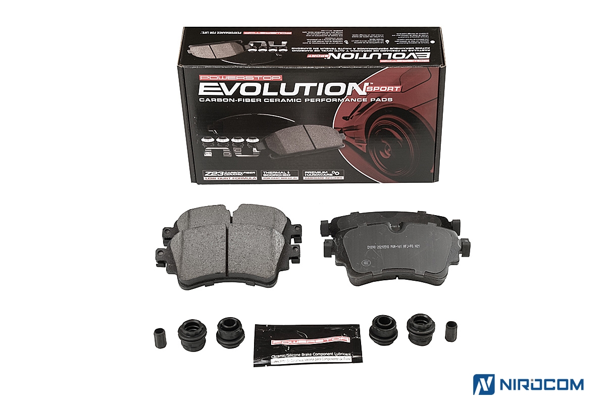 Серия колодок Z23 для любителей активной езды, желающих получить максимальную отдачу от своего автомобиля, не жертвуя повседневной управляемостью. Эти колодки работают при еще более высоких температурах (по сравнению с колодками Evolution Z17). Также был увеличен коэффициент трения, что дает возможность использовать эти колодки на стоковых тормозных суппортах даже при существенном увеличении мощности двигателя. PowerStop Evolution Z23 – это керамический состав, укрепленный углеродными (карбоновыми) волокнами. На практике это высокотемпературная колодка, стойкая к износу с повышенным коэффициентом трения. Колодки серии Z23 относятся к классу "улица/трек", в то время как Z17 – "уличная" колодка. Иными словами, Z23 PowerStop способна легко переварить нагрев до 660С, а также показать более стабильный коэффициент трения – класс FG (0,46-0,55). У колодок серии Z17 класс трения FF (0,36-0,45).